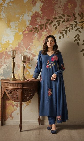 The kurta is beautifully adorned with delicate floral embroidery, adding a soft contrast and artistic touch to the rich Chanderi Silk fabric. Paired with coordinated bottoms and a flowing matching dupatta, this set offers effortless sophistication and comfort.