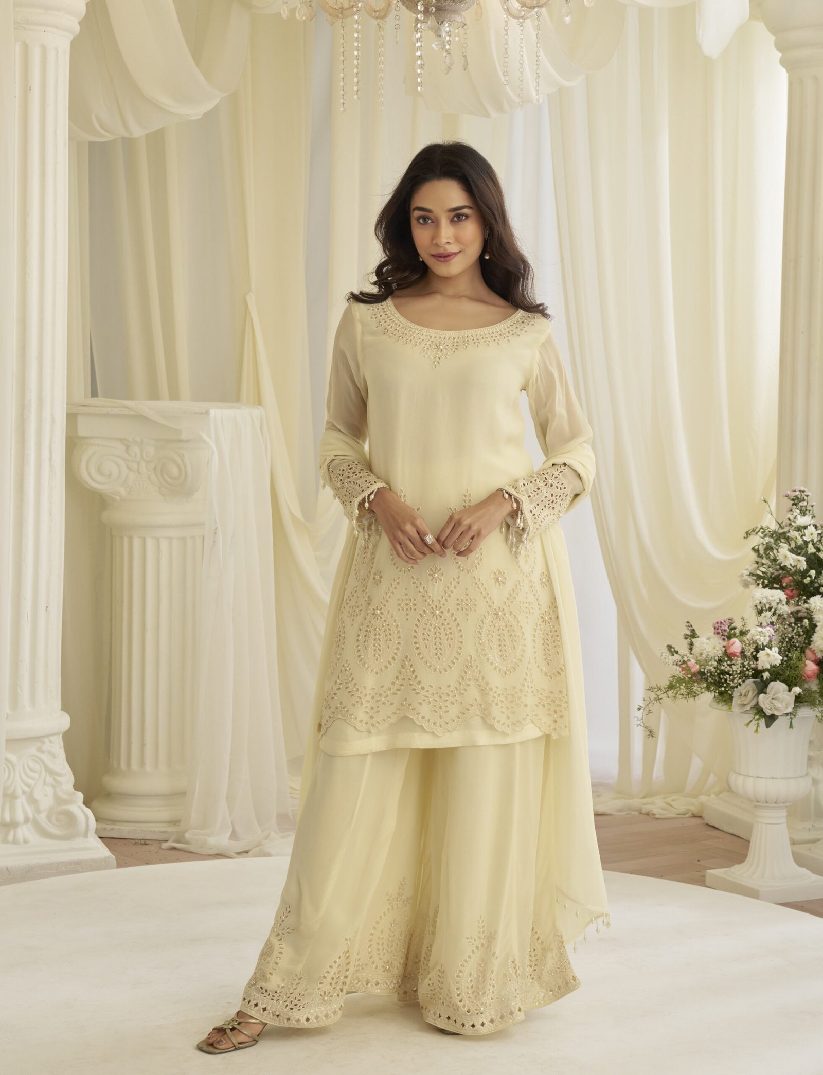 Ivory Cream Embroidered Kurta Plazzo Set in Real Georgette