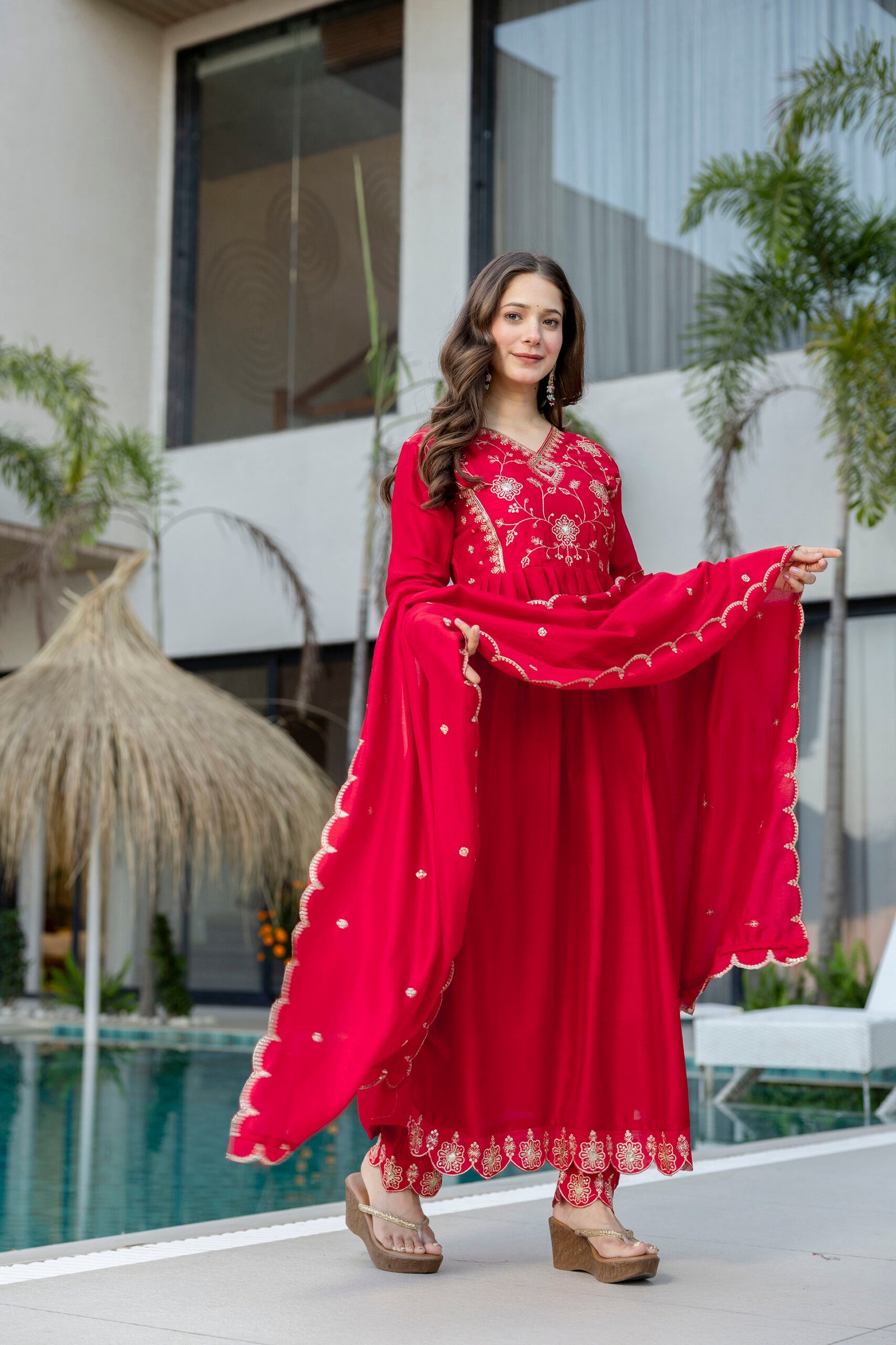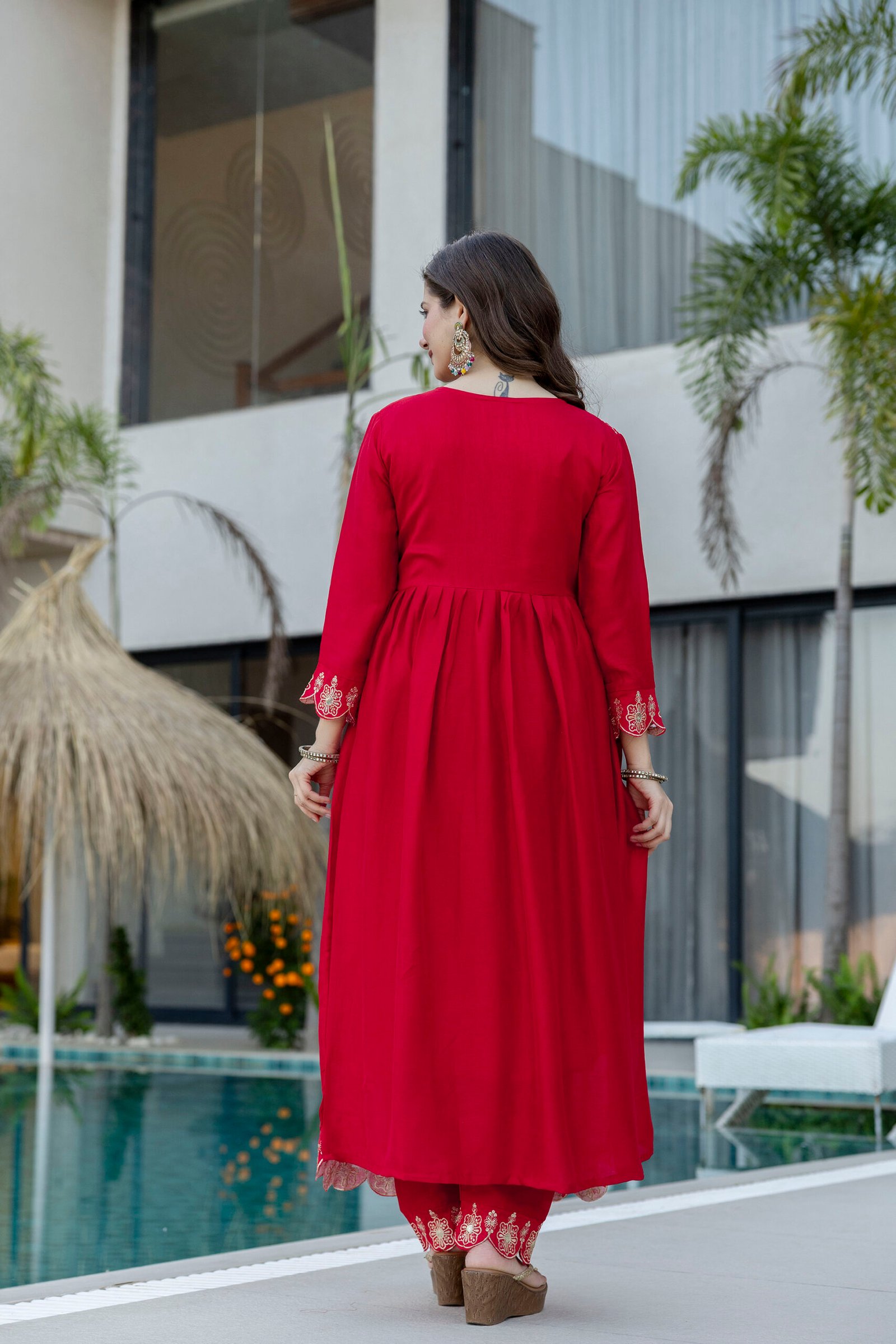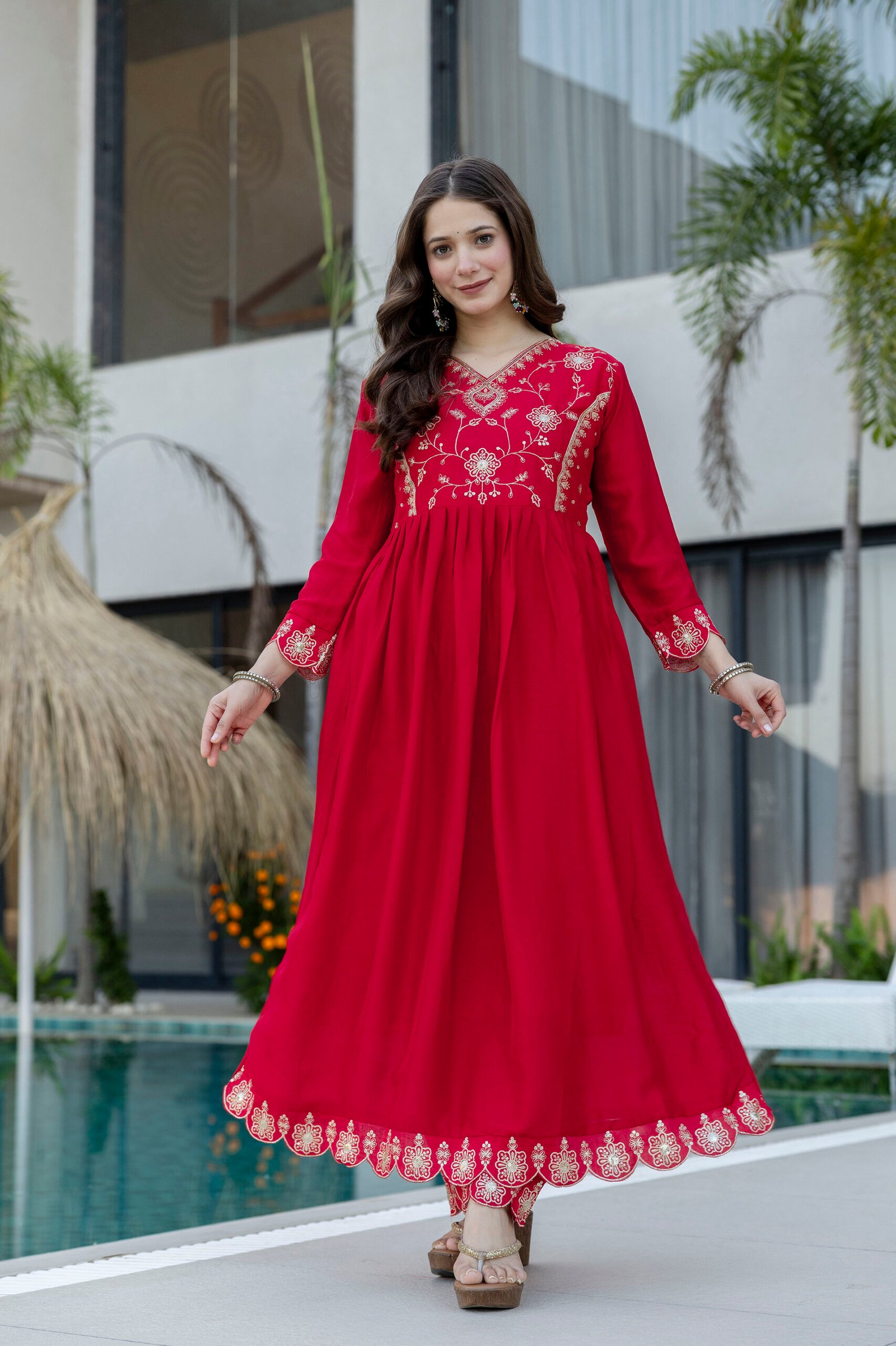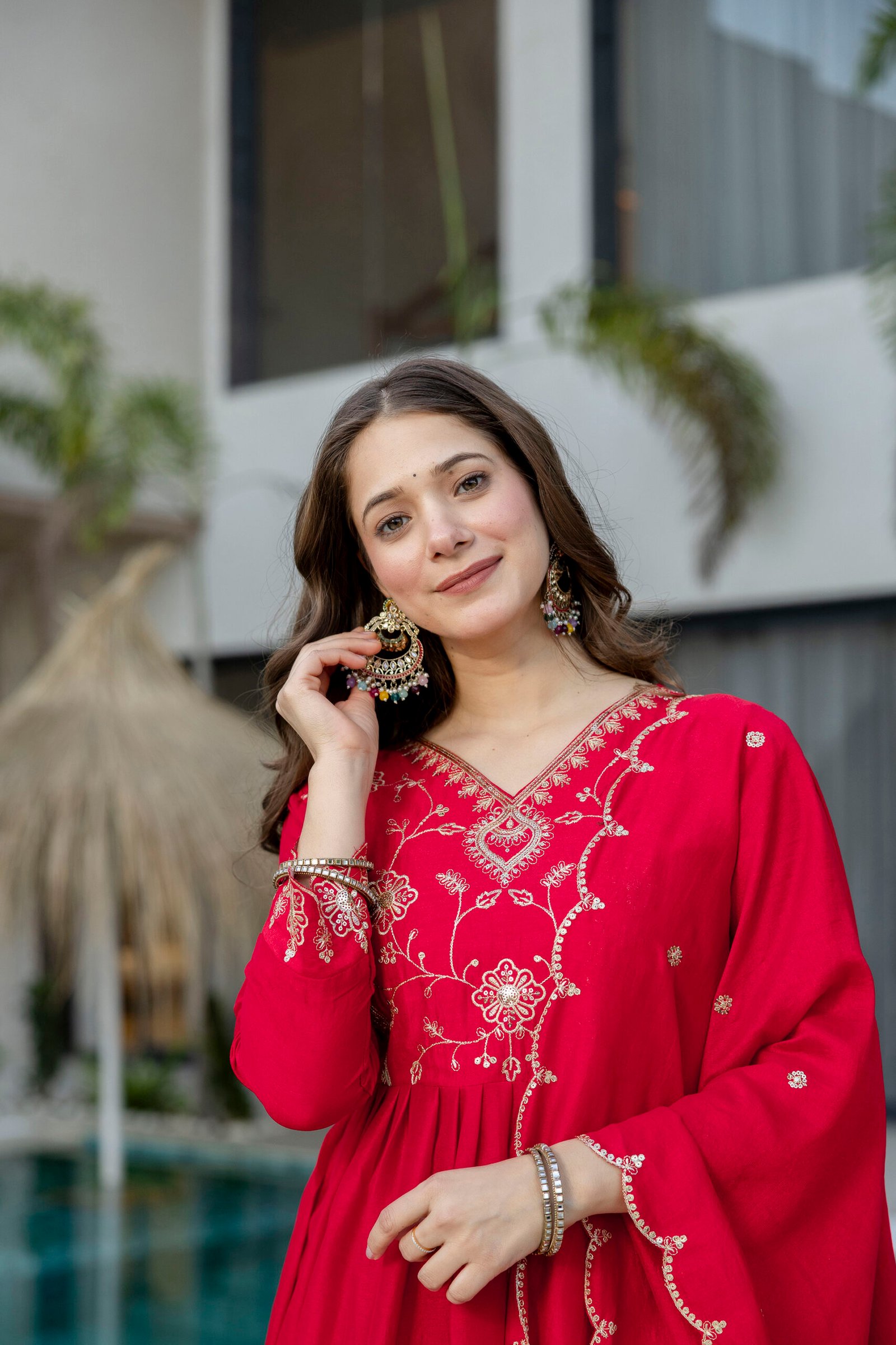 Make a stunning festive statement with this elegant red Anarkali kurta set crafted in luxurious Vichitra Silk fabric. Designed to flow beautifully, the silhouette offers a graceful flare that enhances every movement.