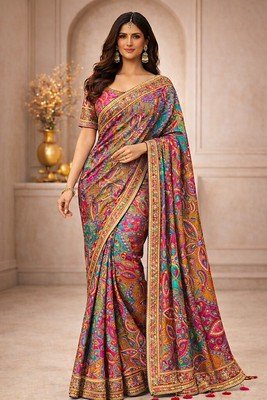 Royal Multicolor Paisley Printed Silk Saree with Embroidered Border